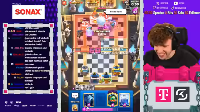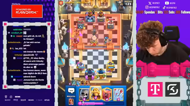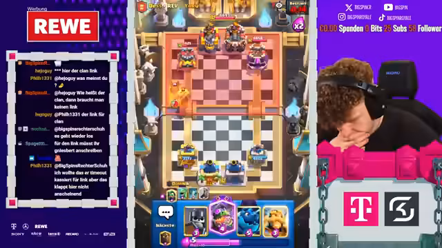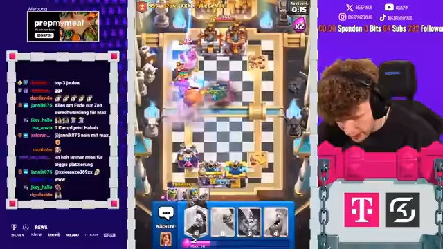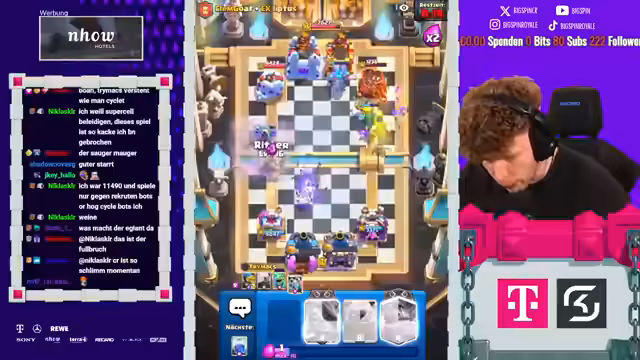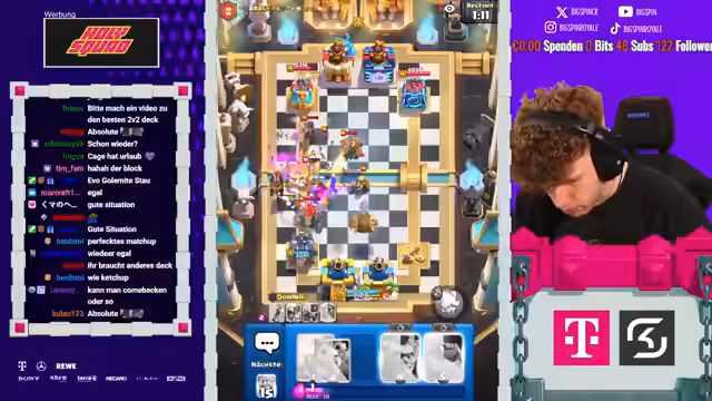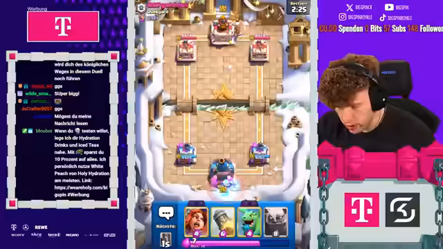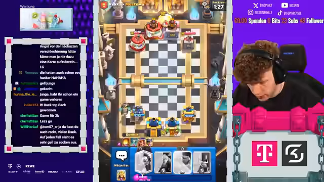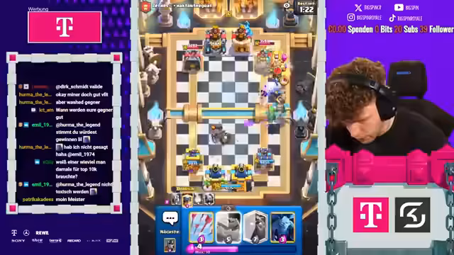 10:25:20Während des Streams kommt es zu mehreren PC-Abstürzen, die den Spielfluss unterbrechen. Der Streamer analysiert die Fehlerquellen, darunter Probleme mit OneDrive, und passt trotzdem seine Strategie an. Er und Dominik optimieren ihre rotationsbasierte Verteidigung, indem sie Karten wie Valkyrie und Poison einsetzen, um gegnerische Pushes zu neutralisieren. Sie diskutieren die Bedeutung von Elixier-Vorteilen und wie sie durch schnelle Reaktionen auf die Spielzüge der Gegner Druck aufbauen, selbst wenn sie technisch eingeschränkt sind.
