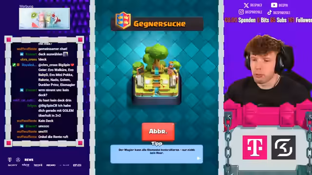 09:29:30Der Streamer beginnt mit der strategischen Vorbereitung auf den 2v2-Ladder-Push. Er und sein Partner Dominik stimmen ihre Decks aufeinander ab, wobei die Kombination aus Empress, Lightning und Phoenix-Karten als Kernstrategie festgelegt wird. Sie besprechen die Bedeutung der Mana-Effizienz und wie sie mit aggressiven Plays die gegnerischen Türme unter Druck setzen können. Die ersten Minuten sind geprägt von taktischen Absprachen, um die richtigen Timing-Fenster für Angriffe zu nutzen und gleichzeitig defensiv stabile Spielfelder aufzubauen.