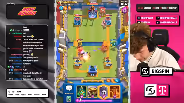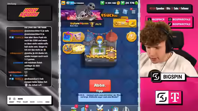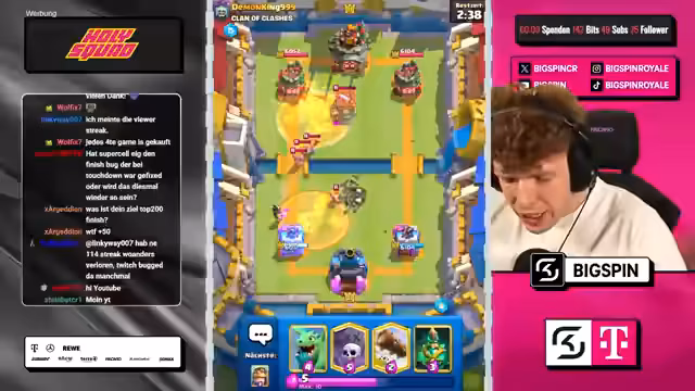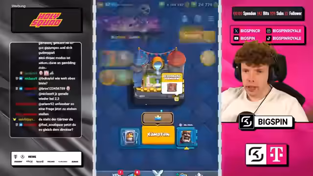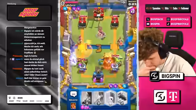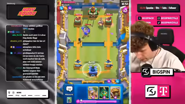 00:01:37Der Streamer widmet sich dem Kern des Streams: den Spielen im Chaos-Modus. Er analysiert seine augenblickliche Platzierung (Top 35) und die benötigten Medaillen für den Aufstieg. Während der Partien werden ständige strategische Überlegungen getroffen, die Wahl der Decks, der Karten und der Augments sind zentral. Der Fokus liegt auf der Suche nach der perfekten Kombination an Karten und Fähigkeiten, um den Gegner zu besiegen. Dabei werden Stärken und Schwächen verschiedener Decks wie 'Graveyard' oder 'Ritter-Spam' diskutiert und die Augments der Gegner kritisch beäugt.