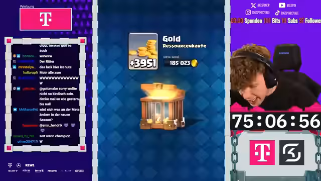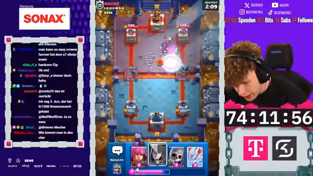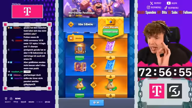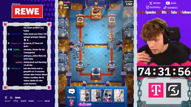 02:25:43Das Hardcore Free-to-Play-Projekt erreicht einen entscheidenden Meilenstein. Der Streamer hat von ca. 6000 auf 6700 Trophäen gepusht und ist nur noch wenige Spiele vom Öffnen des Pass-Royal entfernt. Das Spiel-Deck ist so stark, dass Gegner oft keine Chance haben und schnell besiegt werden. Der Fokus liegt darauf, den Pass so schnell wie möglich zu öffnen, um die Belohnungen zu sichern, da ein weiterer Push zu 8500 Trophäen als zu riskant gilt.
