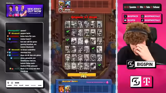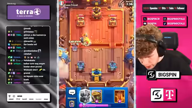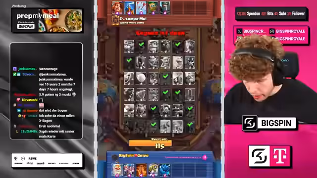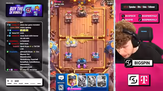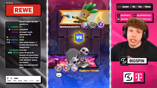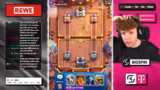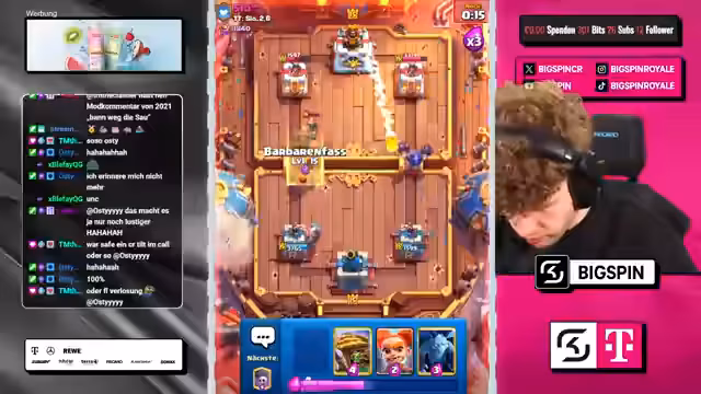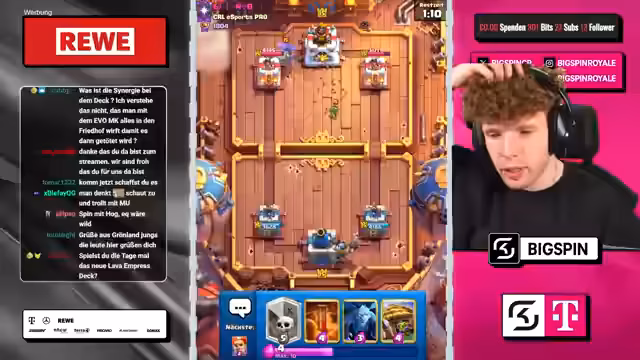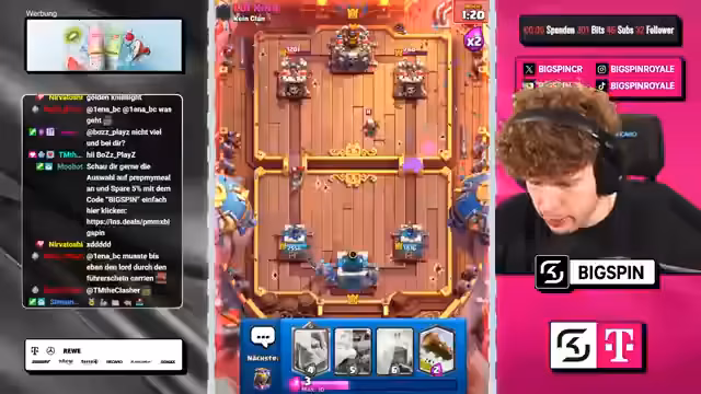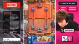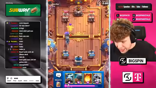 02:42:03Der Streamer gewinnt mehrere Spiele hintereinander und kommentiert seine positive Stimmung und die Siegesreihe. Gleichzeitig äußert er seine Frustration über den häufigen Einsatz des Bogen-Decks im Meta, das er als sehr belastend empfindet. Trotzdem gelingt es ihm, mit seinem Deck konsequent Siege einzufahren und seine Strategie an die jeweilige Spielsituation anzupassen, um den Königsturm des Gegners zu zerstören.
