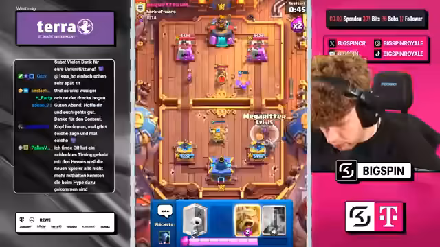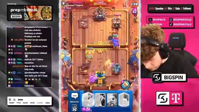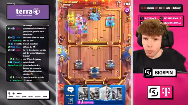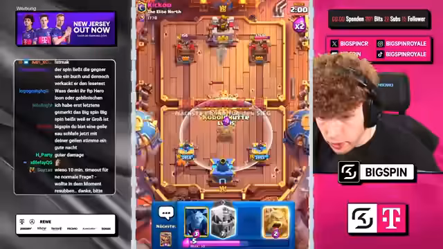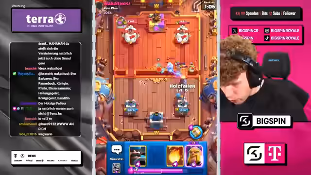 02:03:01Der Streamer wechselt das Deck und spielt nun gegen einen Gegner, der den Doppelgiant zusammen mit Span Magier einsetzt. Der Streamer plant, die Verteidigung mit Ramburg und Holzfäller zu verstärken, um das Spiel in seine Gunst zu lenken. Es wird erwähnt, dass der Gegner noch einen Evo-Rammer hat, was die Situation für den Streamer kompliziert macht und er auf eine gute defensive Reaktion angewiesen ist, um das Game zu gewinnen.