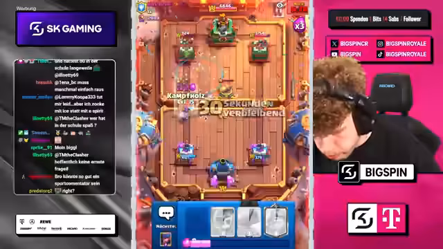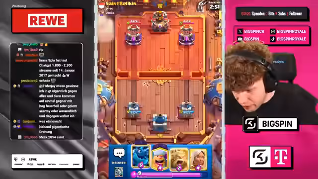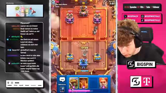 01:51:38Zu Beginn der Sequenz wird das Spiel mit dem MK (Mega Knight) vorne und der Musketierin hinten gestaltet. Der Streamer diskutiert die strategische Ausrichtung, wobei er sich für eine aggressive Variante entscheidet, die den Gegner unter Druck setzen soll. Es werden verschiedene Karten wie Minions, Ofen und Feuerball ins Spiel gebracht, um den Schaden zu maximieren und den Gegner zu zwingen, defensiv zu reagieren, um dem Angriff standzuhalten.