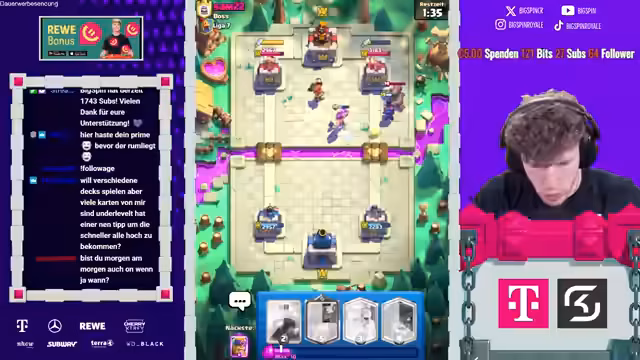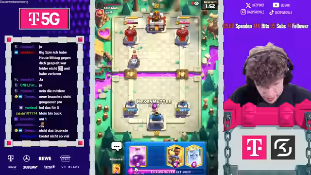 00:54:42Der Streamer analysiert das Spielgeschehen, wobei der Gegner mit riskanten Zügen wie Prinz und Holzfäller an der Brücke agiert, was beim Streamer Stress auslöst. Der Gegner kontert mit einem Evo-Lambo-Cack, dessen Interesse am Turm jedoch gering ist. Der Streamer setzt auf Haigäs in der Mitte und bringt erfolgreich Barbaren ins Spiel, gefolgt vom Holzfäller an der Brücke. Der Gegner verteidigt sich, aber der Streamer spart seinen Rage und setzt stattdessen auf die Widerreiterin. Trotzdem macht der Pissfäller zwei Hits. Der Gegner hat Probleme, gegen das Deck anzukommen und spielt wiederholt gegen eine Wand. Der Streamer setzt einen Heilgast ein, um den Turm zu unterstützen, und kontert die Skelly Barrel des Gegners mit Hexenmutter und anderen Karten. Der Gegner spielt eine Lakaienhorde, was jedoch zu spielerischem Totalschaden führt. Der Streamer greift mit den nächsten Widerreitern an, während der Gegner sich auf den Turm konzentriert. Der Evo Lumberjack des Gegners zerstört einige Barbaren, aber der Streamer bringt den Holzfäller ins Spiel und kontert die Kochung des Gegners mit der hexianischen Mutter und dem Ibu-Lumberkrieg. Der Streamer lobt einen TikTok-Clip von BigSpinClips und erwähnt einen Clip auf YouTube, in dem jemand eine Evo-Rakete zweimal ins Nichts gehauen hat.