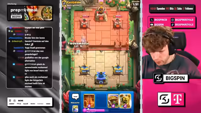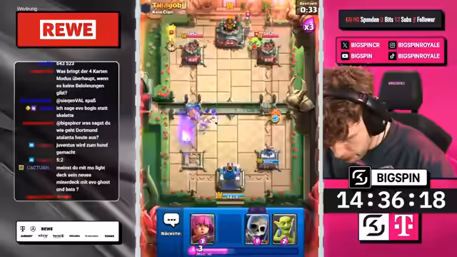 00:39:22Für die weitere Meisterungs-Farm wird eine klare Strategie entwickelt. Der Plan ist, gezielt Karten auf Stufe 2 zu bringen, was im Vier-Karten-Modus ohne Zauber gut machbar ist. In der einfachen Elixir-Phase wird auf stabiles Gameplay geachtet, während in der doppelten Elixir-Phase versucht wird, maximalen Druck aufzubauen, um den Fortschritt bei den Karten wie Bogies und Skeletten voranzutreiben, um die verbleibenden Meilensteine zu erreichen.
