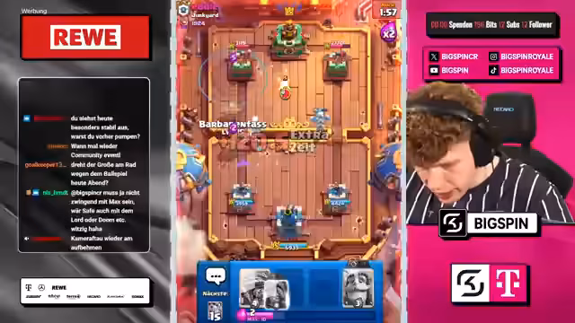00:55:02Der Streamer spielt gegen verschiedene Gegner mit unterschiedlichen Decks. Er setzt auf Skelett-Drachen und Musketier als Teil seines Deck, was gegen Scallywreck-Decks besonders effektiv ist. Bei einem Spiel gegen den Erfinder des Hawks Spiegeldecks setzt der Gegner erfolgreich Mini-Pekka und Hawk ein. Der Streamer bemerkt, dass sein Skelett-Drachen-Deck stark im Metagame ist, da Lightning selten gespielt wird.