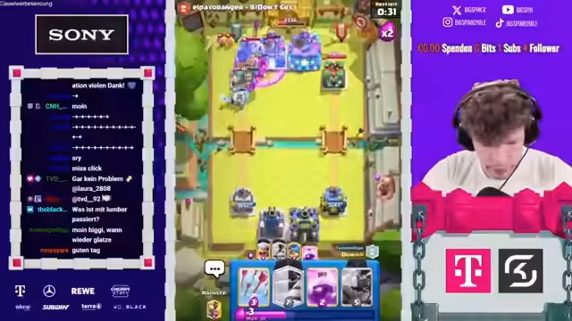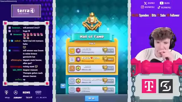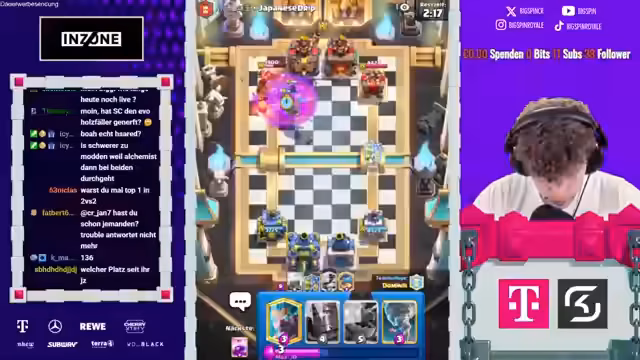 02:17:34Der Stream beginnt mit der Aufnahme an der 2vs2 Ladder. Ein neues, unkonventionelles Deck wird getestet, das keine Standardtruppen wie Phoenix oder Megaminion enthält. Dies führt zu einem beeindruckenden Start, bei dem das Team, bestehend aus dem Streamer und Dominik, mehrere Spiele in Folge gewinnt. Durch diese Serie an Siegen klettern sie in der Rangliste von Platz 29 auf Platz 14 und später sogar auf Platz 7, was das Potenzial des Decks unter Beweis stellt.