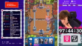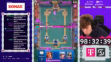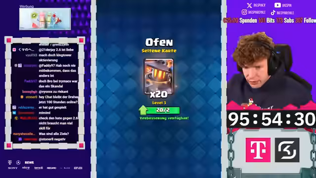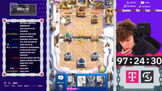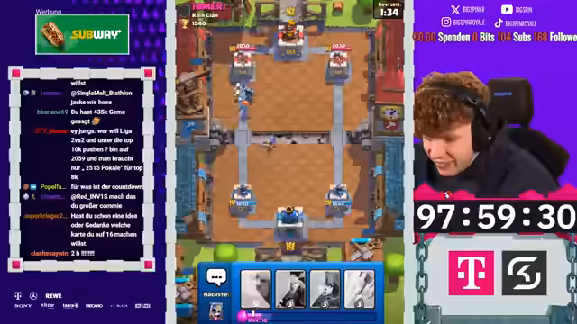 05:23:56Nach sechs Stunden Stream ist der Free-to-Play-Account bereits auf kurz vor 2000 Trophäen. Der Timer für die 100 Stunden läuft, und der Account entwickelt sich schneller als erwartet. Das Hauptziel bleibt, in dieser Zeit 10.000 Trophäen zu erreichen und eine Karte auf Level 16 zu bringen. Um legendäre Karten freizuschalten, muss der Account erst in höhere Arenen vorstoßen. Der Streamer betont, dass die Kartenlevel zentral sind, um gegen Gegner mit besserem Equipment bestehen zu können, und plant den gezielten Einsatz der Tauschmarken für den optimalen Fortschritt.