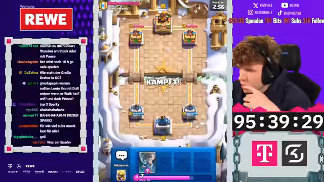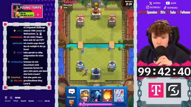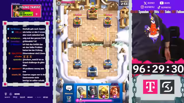 00:52:39Ein neues Hardcore-Free-to-Play-Projekt wurde gestartet, bei dem der Streamer 100 Stunden Zeit hat, um einen Account auf Level 16 zu bringen und 10.000 Trophäen zu erreichen, ohne einen Cent auszugeben. Nach der Aktivierung der Supercell-ID und der Einlösung von 1000 Punkten im Store, wurden die ersten Joker für den Kauf von Karten genutzt. Besonders strategisch ist die kostenlose Evolution der Bogenschützen bei 3000 Trophäen, weshald die Joker dafür gespart werden.