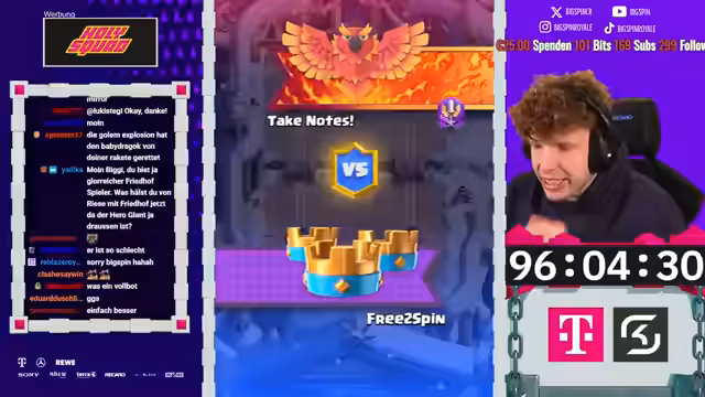 00:15:13Der Streamer startet einen brandneuten Account namens 'Free to Spin' und geht sofort ins erste Spiel. Die Anfangsphase verläuft erfolgreich, mit ersten Siegen und dem Ansammeln von Gold und Ressourcen. Der Fokus liegt zunächst darauf, schnellere Truppen zu upgraden, um durch die Arenen zu kommen. Es wird bereits die strategische Überlegung erwähnt, welche Karte letztendlich auf Level 16 gebracht werden könnte, da dies ein flexibles Ziel ist.