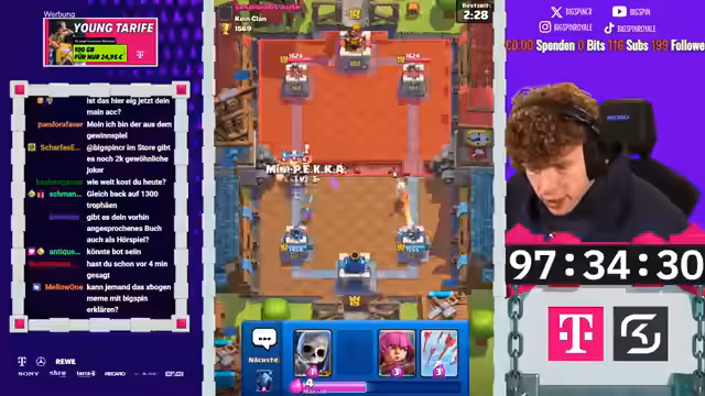 01:27:09Nachdem das Zauberteil und somit die 1000 Trophänen-Marke erreicht wurde, konzentriert sich der nächste Streamabschnitt darauf, Level 8 zu erreichen und die Events freizuschalten. Der Plan ist, Gold aus dem Battle Pass zu holen, um Karten aufzuwerten und schnell an die für Events notwendige Arena zu gelangen, um die Belohnungen, insbesondere den 5-Star-Drop, zu sichern.