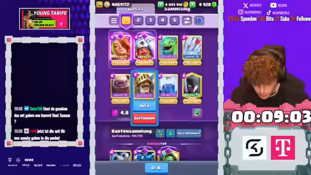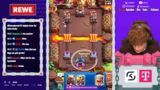00:10:50Der Streamer erwähnt seine Erfolge im Duo-Modus, wo er mit seinem Partner Dominik Platz 45 erreicht hat und damit einen persönlichen Rekord brach. Anschließend startet die angekündigte 'Sneaky Golem Copy Challenge', in der er alleine gegen Gegner antritt. Hierbei wird jedes gegnerische Deck kopiert, aber jeweils eine Karte durch Golem ersetzt, um eine unfaire, aber unterhaltsame Herausforderung zu schaffen.