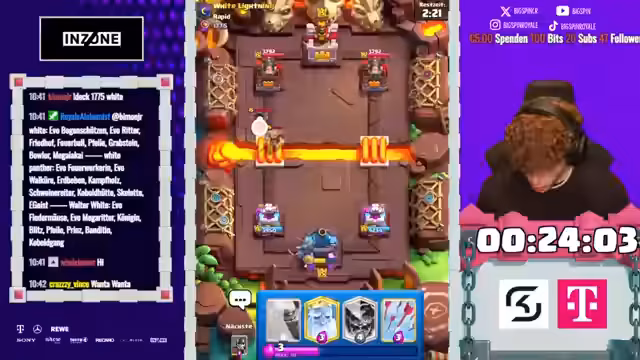 00:24:49Der Streamer spielt weiterhin verschiedene Gegner mit dem Golem-Deck und modifizierten Versionen. Dabei zeigt er unterschiedliche Strategien, wie den defensiven Einsatz von Karten oder den gezielten Angriff mit dem Golem. Während manche Spiele durch Disconnects der Gegner vorzeitig enden, führen andere zu spannenden Duellen mit komplexen Manövern und einer Vielzahl von Kartenkombinationen.