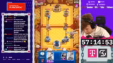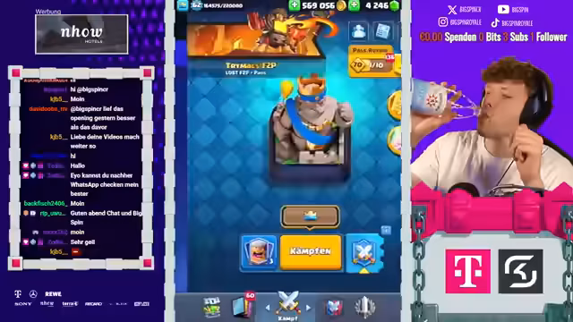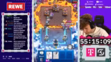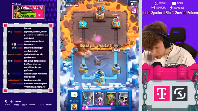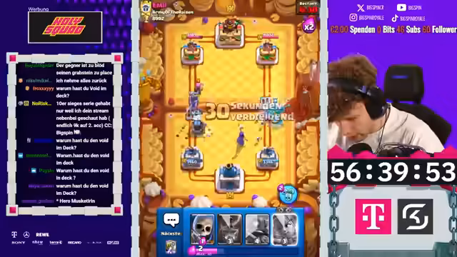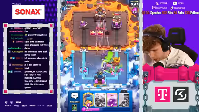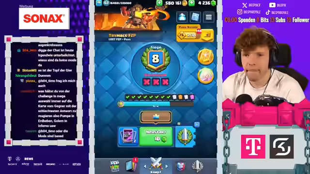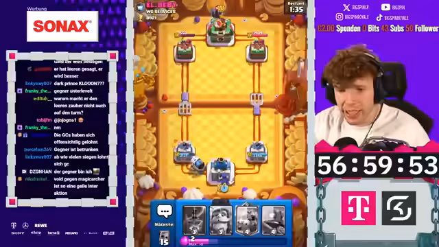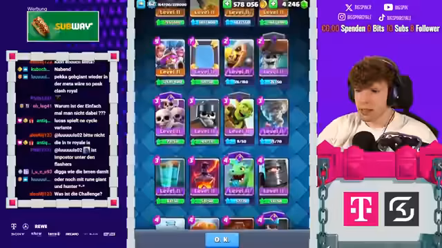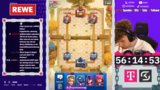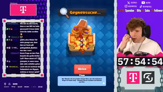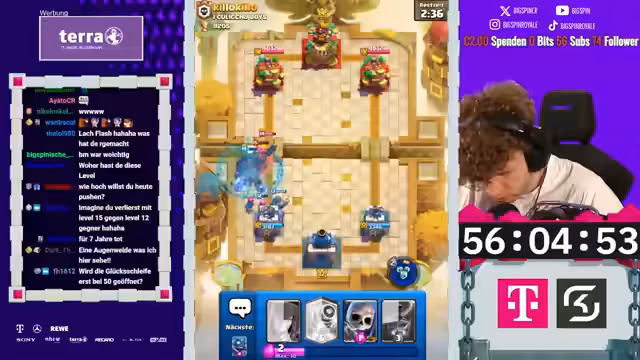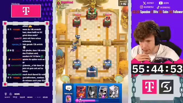 04:01:52Auf dem Free-to-Play-Account hat der Streamer noch 55 Stunden Zeit, seine Ziele zu erreichen: Level 16 für eine Karte und 10.000 Trophäen. Aktuell liegt er bei Level 14 und 9.300 Trophäen. Ein Gegner mit sehr niedrigen Leveln, aber starken Karten wie Schweinereiter und Hawk Rider, wird als "Grauen" bezeichnet. Das Verständnis, wie man mit 100 Stunden viel erreichen kann, ist Teil des Projekts.