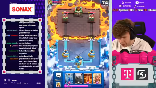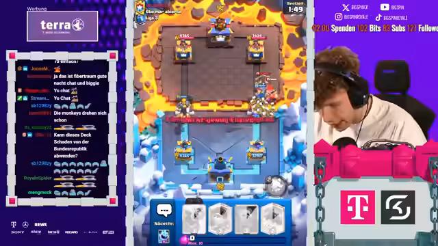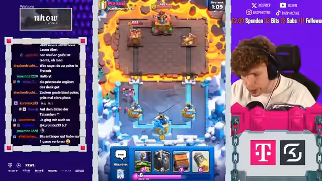 00:00:39Das Stream-Duo beginnt mit der Präsentation eines extrem coinflippigen Decks für Clash Royale, das als "härtestes Coin-Flip-Deck" positioniert wird. Es basiert auf Golem, Klonzauber, Nachthexen und Rakete, um den Gegner schnell unter Druck zu setzen und schnelle Siege oder Niederlagen zu erzwingen. Das Deck wurde nach Recherche in den Top 200 als eines der eingeschränksten und riskantsten identifiziert, um der Herausforderung zu begegnen, fast ausschließlich gegen Ultimate Champions zu spielen.