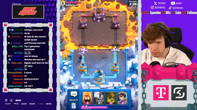 02:19:35Auf dem Weg zu den 9.000 Trophäen treten zunehmend Gegner aus der höheren Arena auf, die mit völlig überlevelten Karten wie dem Mini-Packer (Level 16) spielen. Das führt zu frustrierenden und scheinbar ungewinnbaren Spielen, da der Gegner mit Karten wie einem Feuerball alles vernichten kann. Der Streamer ist verärgert über diese unfairen Matchups, die aus seiner Sicht kurz vor einer Arena-Aufstieg immer auftauchen und ein schnelles Weiterkommen unmöglich machen. Einige Spiele gehen durch simple Fehler, wie den verzögerten Einsatz einer Karte, verloren.