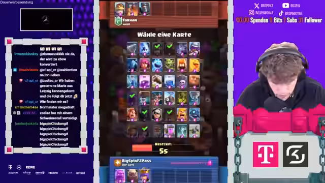 01:25:19Es werden ironische Kommentare über die Fähigkeiten des Gegners gemacht und ein Gegner gefordert, der das Spiel beherrscht. Es wird überlegt, welche Karten noch gepickt werden sollen, wobei der Fokus auf Drill und E-Golem liegt. Die Situation wird als Albtraum beschrieben, und es wird überlegt, wie man das Spiel noch retten kann. Es wird festgestellt, dass der Gegner unerwarteten Schaden verursacht hat, und die Hoffnung geäußert, dass der 'Dumme' als nächster Gegner kommt. Eine Challenge wird vorgeschlagen, bei der der Verlierer eine Salami-Stick-Lasagne zubereiten muss. Es wird über die Auswahl von Karten wie ARG und Epic Lightning diskutiert und ein neues Seven-TV-Remote von Kurzmute erwähnt. Die Teamzusammensetzung wird als problematisch angesehen, da es keine Karte gegen Archer Queen gibt. Der hohe Elixierdurchschnitt des Decks wird kritisiert, und es wird die Frage aufgeworfen, warum Big Spin die Karte sagt, wenn Sam an der Reihe ist. Insgesamt wird die Situation als herausfordernd und frustrierend beschrieben, wobei die Spieler versuchen, das Beste aus ihren Entscheidungen zu machen.