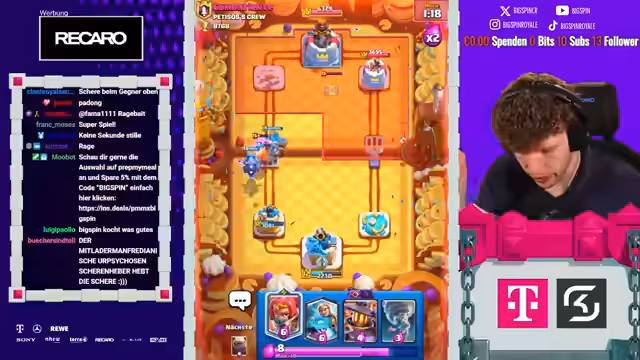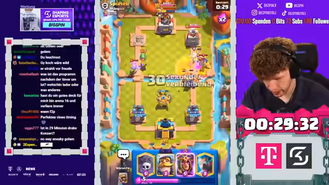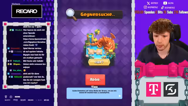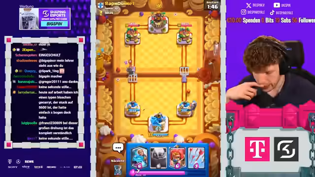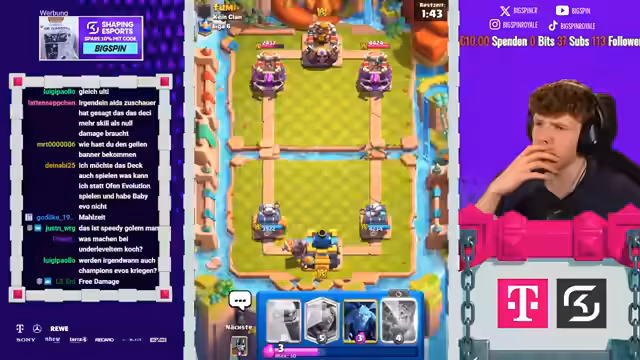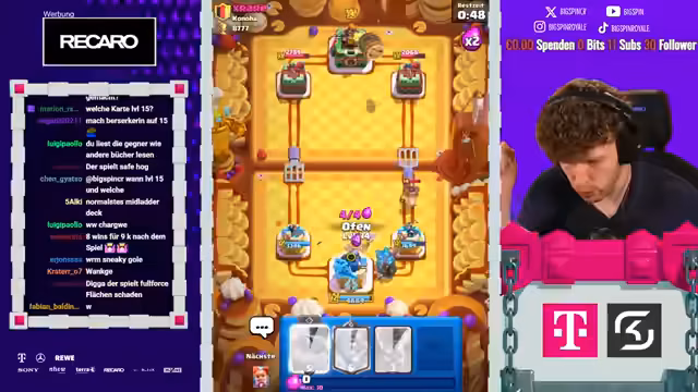 00:40:46Der Stream startet mit einem Sieg im Level-14-Ofen-Deck. Nach einem anfänglich schwierigen Matchup gegen einen überlevelten Gegner gelingt es durch die effektive Nutzung der Boss-Banditen und des Elektro-Dragons, den Turm zu zerstören. Die entscheidende Interaktion ist hierbei der überlevelte Poison-Spell des Gegners, der diesen zu einem schlechten Spielzug zwingt und den Sieg ermöglicht. Der erste Sieg mit der neuen Level-15-Karte ist perfekt. Dennoch gibt es Bedenken wegen der geringen Drop-Rate des Kochs.