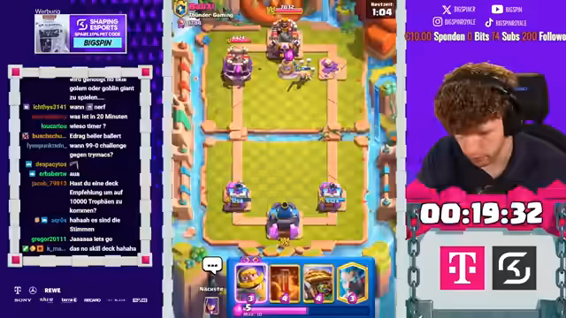 00:59:19Nach einer Reihe von Erfolgen mit dem Golem-Deck, das eine Siegesserie von 17 Spielen aufweist, startet der Streamer einen gezielten Full-Focus-Push in der Ladder. Der Wechsel von einem lustigen Deck auf ein Meta-Greyfair-Deck dient der Konzentration und der Höherentwicklung des Accounts. Das Ziel ist es, innerhalb einer Stunde so viele Trophäen wie möglich zu sammeln, um die Performance in der aktuellen Saison zu maximieren.