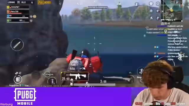 00:41:56Nach dem intensiven Duell wechselt der Streamer zu dem angekündigten Spiel PUBG Mobile. Die Stimmung ist gelöst und der Streamer interagiert weiterhin stark mit dem Chat. Er kündigt an, gemeinsam mit Trymacs zu zocken und erwähnt die unterschiedlichen Startorte und das Ziel, im Spiel zu überleben und den Sieg zu erringen.