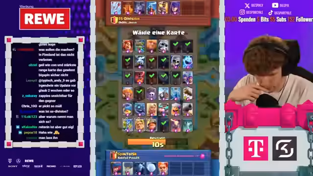 00:51:08Der Streamer analysiert ein intenses Clash Royale-Duell, wobei er sich auf die Auswahl und den Einsatz verschiedener Karten konzentriert. Er kritisiert Entscheidungen des Gegners, wie den First-Pick eines Erdbeben-Zaubers, den er als schwach erachtet, und kommentiert den erfolgreichen Einsatz von Karten wie Minions, Hunter und Elite-Barbaren. Er äußert sich frustriert über mangelnde Synergien im Gegner-Deck und die unvorhersehbaren Spielzüge, die oft zu Verlusten führen, obwohl er teilweise im Vorteil war.