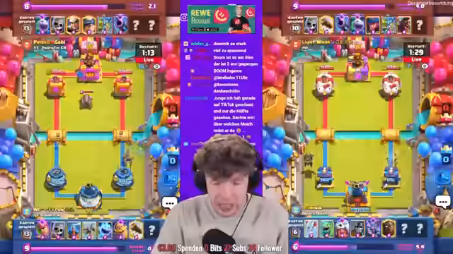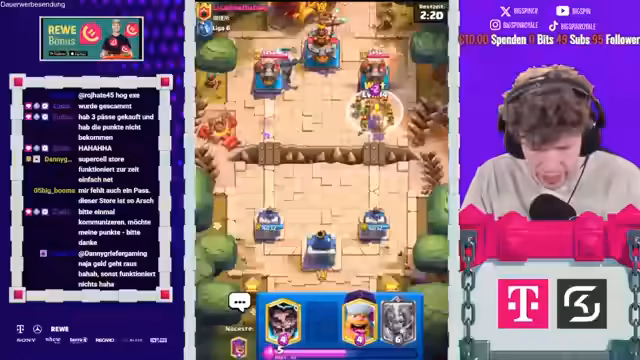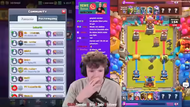 00:33:04Riley spielt gegen Polaris. Die Bossbanditin sollte mit der neuen Season herauskommen. Riley gewinnt das Spiel. Wallace hat den Streamer auf dem Main-Account gekickt, aber auf dem zweiten Account ist er noch in seiner Liste. Riley spielt gegen Rin, der zuvor vom ersten Platz verdrängt wurde. Rin spielt ein Drill-Deck mit Evo Schneeball. Wallace und Dominik spielen gegeneinander. Rin hat keinen Log am Start, was ihm zum Verhängnis wird. Riley gewinnt erneut und freut sich über eine Menge Trophäen. Titan ist weiterhin auf Platz 1. Platz 18 und Platz 1 trennen weniger als 100 Trophäen. Es wird gesagt, dass Ruin selber schuld ist. Das Spiel auf der 1, das ist nicht der Weg. Auf der 1 zu spielen, das ist nicht der Weg. Es wurde nach der Clash Royale-Freundesliste gefragt.