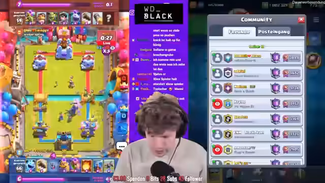 00:00:00Der Stream beginnt mit einem Blick auf die aktuelle Rangliste kurz vor Seasonende. Rin führt die Liste an, dicht gefolgt von Bad Fuzz auf Platz 2 und Titan auf Platz 4. Es fällt auf, dass viele Top-Spieler X-Bow verwenden. Dominik und Ian treffen aufeinander, wobei Ian ein interessantes Deck spielt. Trotz leichter gesundheitlicher Probleme ist die Stimmung gut, und es wird ein weiterer Stream am Abend zur neuen Karte und Evolution angekündigt. Morten und Joy setzen auf Royal Hogs, was zeigt, dass am Seasonende oft unerwartete Decks auftauchen. Rin spielt ein Poison-Deck ohne Evo Snowball, was ungewöhnlich ist. Es wird erwähnt, dass X-Bow seit Langem nicht mehr so stark in den Top-Rängen vertreten war. Die verbleibende Zeit der Season beträgt noch eine Stunde und 50 Minuten. Death snipe oft, was für Aufsehen sorgt.