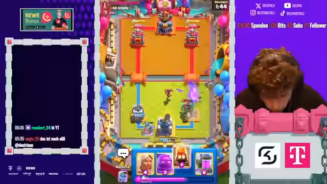 01:44:32Ein ungeschickter Zug des Gegners – ein X-Bogen gegen einen Mini-Peka – wird vom Streamer als 'krass' bezeichnet. Der Streamer lässt es laufen, da der gegnerische Zug suboptimal war. Eine Fledermaus überlebt bei Glück, doch der Gegner erobert einen Giant zurück. Der Schaden wird als nicht kassierbar angesehen, und eine Rakete des Gegners wird als sehr stetig bewertet.