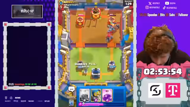 01:49:17Das Spiel wiederholt sich mit einem Giant Sparky des Gegners, der mit Rakete beantwortet wird. Das Problem: der Streamer hat keine effektive Karte gegen die gegnerische Minion-Horde, da seine Pfeile vernascht werden. Er bleibt dabei, dass ein gesprungener Eisgeist das Spiel hätte gewinnen können, sieht aber die aktuelle Situation als 'absolute Gigaschere' an. Es wird zum 'Besten der Beste' betitelt.