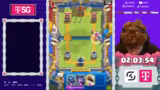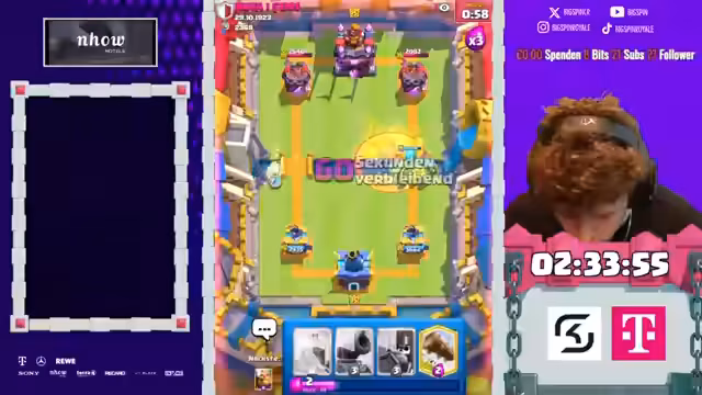 00:33:48Der Streamer nutzt weiterhin die kopierten Gegner-Decks, erleidet aber weiterhin Niederlagen. Das Spiel gegen ein 2.6-Deck verliert man durch einen nachlässigen Eisgolem-Einsatz. Anschließend spielt man gegen denselben Gegner wie am Anfang des Streams mit dem Royal Giant Triple Spell Deck und verliert ebenfalls. Die Stärke der Gegner-Decks und das eigene Pech führen zu einer ernüchternden Serie von Verlusten.