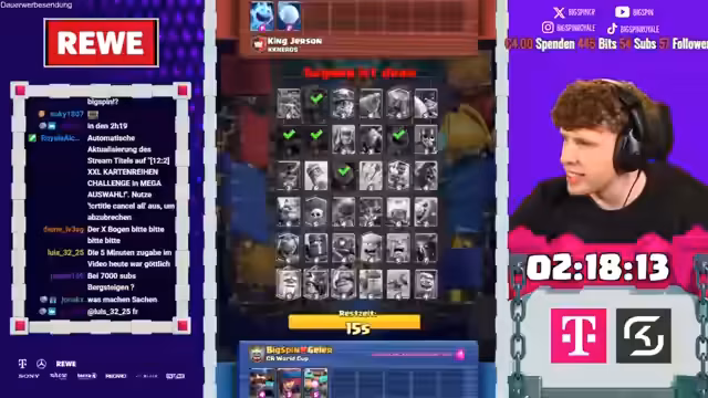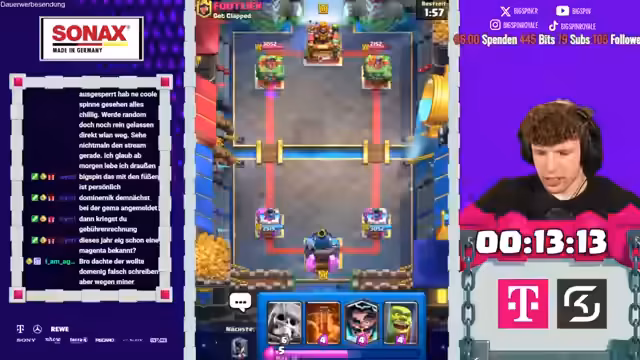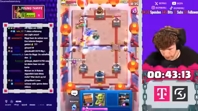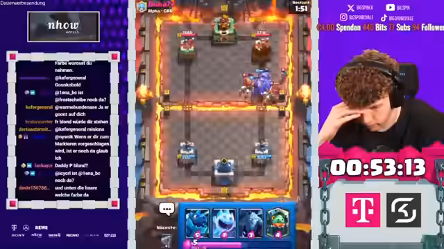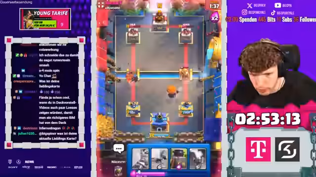 02:16:17In den späteren Spielen des Streams sieht sich der Streamer mit einem schwierigen Aufbau konfrontiert, als er gezwungen ist, den Sepp und den Ice Golem zu picken, was gegen starke Decks wie das des Gegners nicht optimal ist. Trotzdem gelingt es ihm, mit dem Goblin Giant und dem Minipacker Druck auszuüben. Der Gegner nutzt jedoch seine starken Karten wie die Rakete und den Feuerball, um in Führung zu gehen. Trotzdem zeigt der Streamer große Geduld und findet Wege, mit dem Hunter und dem Miner das Spiel zu stabilisieren, auch wenn es ihm nur gelingt, das Unentschieden zu halten und den Gegner am Sieg zu hindern.