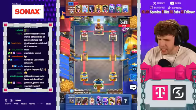 00:58:56Der Streamer plant spontan ein 2-vs-2-Zocken mit Max und einem weiteren Mitspieler für das Spiel Clash Royale. Die anfängliche Absicht war, dies im Spiel *Max* zu tun, doch der Streamer realisiert, dass dies mit Zuschauern nicht möglich ist. Stattdessen wird der Plan geändert, es soll auf einem anderen Account gespielt werden. Die Gespräche sind von etwas hektischem Verhalten und leichter Verwirrung geprägt, was zu scherzhaften Kommentaren vom Streamer führt.