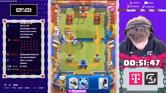 00:47:04Der Streamer wechselt erneut das Deck und fragt sich, was der Gegner spielen wird. Er setzt ein Mega-Minion und der Gegner kontert mit einem Baby-Drachen. Der Streamer spielt aggressiv mit einem Mini-Pekka, aber der Gegner hat einen Grabstein. Er äußert seine Verzweiflung darüber, dass der Gegner nur Schaden spielt und er selbst geballert wird. Trotz einer schlechten Situation versucht er, das Spiel zu drehen. Er setzt einen Golem und der Gegner kontert mit einem Bomber. Der Streamer versucht, mit Lightning und Nado gegenzuhalten, was teilweise gelingt. Er bemerkt, dass der Gegner sehr defensiv spielt und er versucht, ihn aus der Reserve zu locken. Er setzt erneut einen Golem und der Gegner gibt auf. Der Streamer freut sich über den Sieg und analysiert seine Spielzüge. Er kündigt an, dass er nun mit dem No-Damage-Deck weiterspielen wird.