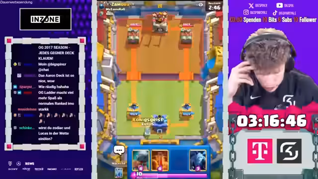 02:02:55Nach einer Phase wechselnder Erfolge und Misserfolge steht der Streamer erneut vor Herausforderungen. Er kopiert ein Deck, nur um festzustellen, dass er wieder gegen 2.6 antreten muss, mit dem er bisher eine negative Bilanz hat. Trotzdem gibt er nicht auf und versucht, das Spiel zu gewinnen. Er setzt einen Eisgeist ein, um das Spiel zu eröffnen, und trifft auf ein Giant Schweinereiter Deck. Er erkennt schnell, dass es sich um eine ähnliche Situation wie zuvor handelt und äußert seine Frustration darüber. Der Streamer sieht kaum Möglichkeiten, sich gegen den Giant Miner zu verteidigen, da seine Kanone ohne Grund zerstört wird. Er hadert mit der Situation und fragt sich, was er tun soll. Trotz der Schwierigkeiten gibt er nicht auf und versucht weiterhin, das Spiel zu drehen. Er betont jedoch, dass es extrem schwierig ist, gegen diese Art von Decks anzukommen, da er kaum Kontermöglichkeiten hat. Die Situation wird als frustrierend und unfair empfunden, was den Spaß am Spiel erheblich mindert.