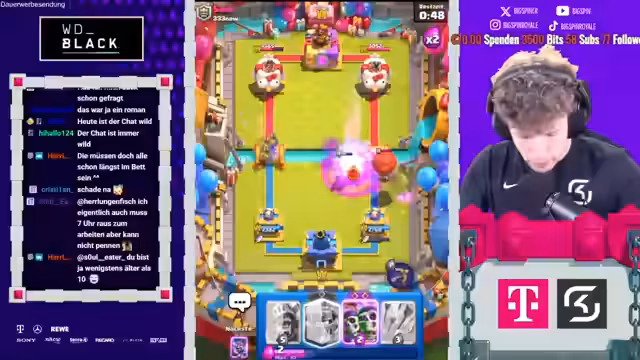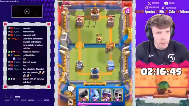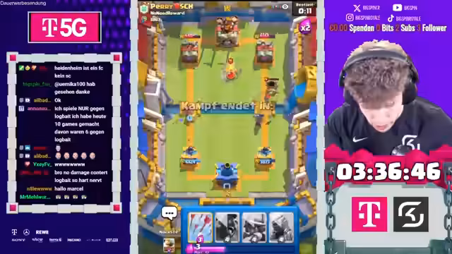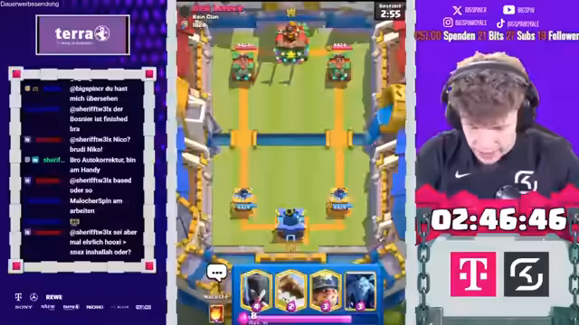 00:12:31Im dritten Spiel gegen Käfer Noah wird ein ungewöhnliches Deck verwendet, was den Streamer vor Herausforderungen stellt. Der Gegner setzt auf Royal Giant und einen Evus, was für Überraschung sorgt. Trotz anfänglicher Schwierigkeiten gelingt es dem Streamer, mit Prinz und Musketieren zu kontern und einen Vorteil zu erlangen. Das Spiel bleibt jedoch spannend und erfordert präzise Züge, um den gegnerischen Angriffen standzuhalten. Am Ende kann der Streamer das Spiel gewinnen und das Deck des Gegners kopieren. Nach dem Sieg mit einem Deck, das zuvor mit Skeletten und Holzfäller erfolgreich war, steht der Streamer einem Gegner mit einem RG-Deck gegenüber. Der Einsatz des Eos erweist sich als weniger effektiv als erwartet. Der Gegner überrascht mit einem Mortar-Deck und zwingt den Streamer zu defensiven Maßnahmen. Trotz des Einsatzes von Guards und Lightning gelingt es dem Streamer nicht, die gegnerischen Bogenschützen zu stoppen, was zu einem schwierigen Matchup führt.