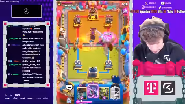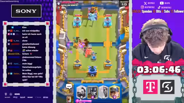 02:09:08Der Streamer analysiert seine Spielzüge und die seines Gegners, wobei er feststellt, dass seine anfängliche Strategie nicht aufgeht. Er plant, den Pekka des Gegners zu kiten und die Banditen einzusetzen, doch diese Taktik scheitert zunächst. Trotzdem gelingt es ihm, Schaden am Turm zu verursachen und eine Pumpe zu platzieren. Er kommentiert, dass er seit fünf Jahren keine drei Musketiere mehr gespielt hat, aber trotzdem erfolgreich ist. Anschließend bereitet er sich darauf vor, mit dem Deck seines Gegners zu spielen, äußert sich jedoch besorgt über die Effektivität von Brücken-Spam und die Auswirkungen von Evolutionen und Turm-Truppen auf das Spielgeschehen. Er lobt den aktuellen Zustand des Spiels und den Spaß, den er daran hat, obwohl er sich der Herausforderungen bewusst ist.