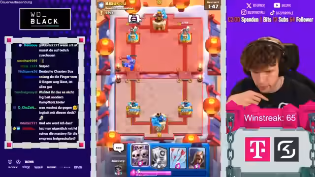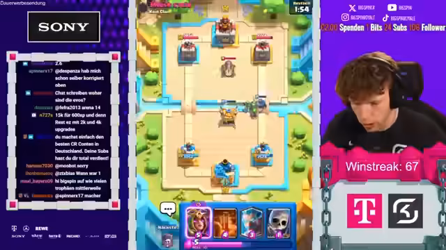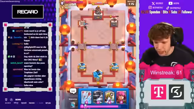 00:19:25Im Verlauf des Streams baut der Streamer beeindruckend an einer Siegesserie auf und erreicht mit 67 aufeinanderfolgenden Siegen einen neuen persönlichen Rekord. Das gespielte Deck, bestehend aus Karten wie dem Evo-Magier und dem Mega-Ritter, zeigt sich als äußerst effektiv. Trotz des anhaltenden Erfolgs wird ein zentrales Problem deutlich: der Streamer hat zwar die nötige Trophäenzahl für Arena 15, wird aber durch das Level 24 massiv im Fortschritt gehemmt. Dies erfordert strategische Entscheidungen über die zukünftige Verwendung von Ressourcen.