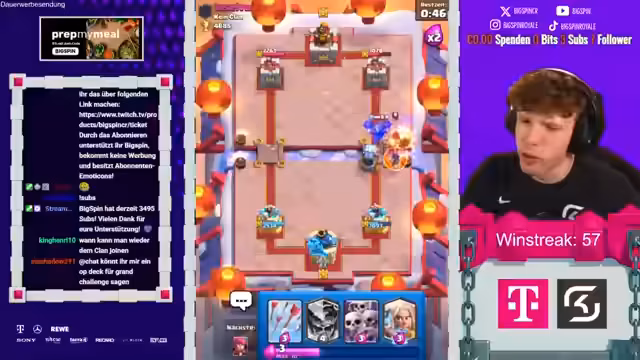 02:49:31Nachdem die Truhe aus dem Match gegen den überlevelten Gegner geöffnet wurde, startet der Streamer das große Opening seines Pass Royals. Er hat den Kauf des Passes bewusst aufgeschoben, um den Inhalt erst bei Arena 16 voll ausnutzen zu können. Die ersten Belohnungen aus den Gold- und Giant Truhen sind ordentlich, aber im Vergleich zu früheren Updates deutlich magerer geworden. Die Lucky Drops selbst gestalten sich jedoch sehr enttäuschend. Der Streamer öffnet zahlreiche Drops und erhält überwiegend nur Ein- und Zweier-Drops, ohne einen einzigen Vierer- oder Fünfer-Drop zu ziehen. Lediglich ein glücklicher Vierer-Drop mit fast 1800 Pfeilen und ein anderer mit legendären Jokern werden als positive Ausnahmen gewertet.