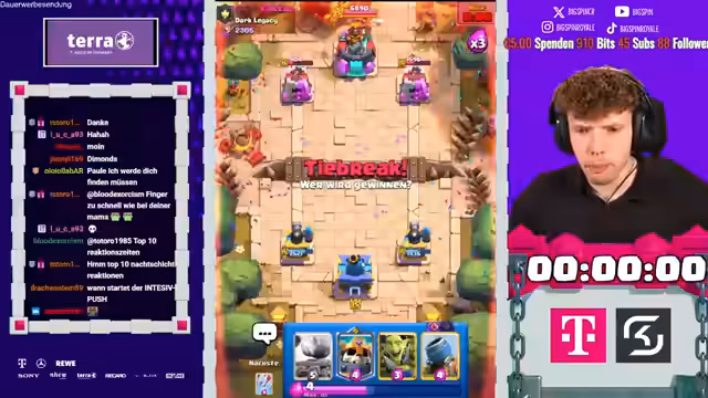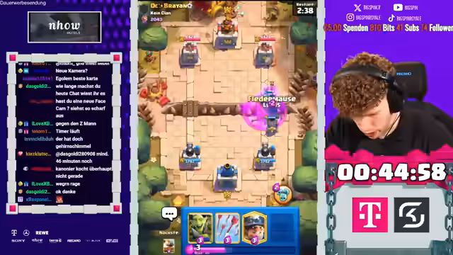 00:44:59Zu Beginn des Streams läuft die aktuelle Runde weiter. Der Gegner wird in die Defensive gedrängt und lässt die Lane durchlaufen, da er gezwungen ist. Nach einem Sieg stellt der Streamer sein neues Deck vor und wählt den Royal Giant und den Ofen. Das Deck wird als sehr stabil und geil beschrieben, trotz anfänglicher Bedenken gegenüber dem Curse und dem E-Dragon.