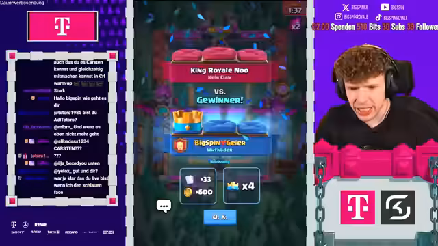 03:02:27Gegen ein E-Spel-Deck mit Fliegenden Maschinen und Seppis verliert der Streamer zunächst die Kontrolle. Er erkennt jedoch seine Chance, als der Gegner keine Pfeile mehr hat. Mit perfekt getimten Evo-Bats und Royal Hawks schafft er es, den Königsturm zu zerstören, was er als einen verrückten und unglaublichen Sieg bezeichnet, den er eigentlich nicht gewinnen durfte.