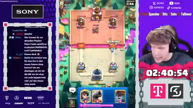 02:51:04Die positive Stimmung ist von kurzer Dauer, als der Streamer erneut auf problematische Gegner-Decks trifft. Er spielt gegen ein X-Bogen-Deck mit '7 Spells' und fühlt sich ausgeliefert, da er keine Karten hat, um die Verteidigung des Gegners zu überwinden. Er äußert seine 'mentale Erschöpfung' und 'Sauer' über die Häufigkeit solcher Matchups. Er beschreibt die Spiele als 'Dresch und Zerg gespielt' und gibt an, am Ende seiner mentalen Kräfte angelangt zu sein, obwohl er über 300 Trophäen im Stream gewonnen hat.
