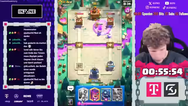 00:38:24Im Verlauf des Streams werden unterschiedliche gegnerische Decks analysiert und deren Stärken und Schwächen diskutiert. Ein Gegner spielt ein anscheinendes Albtraum-Deck mit Runenriesen, Inferno-Turm und Durchreiter, gegen das das eigene Deck keine Verteidigung hat. Gegen ein weiteres Deck mit Cage, Laberhund und Rage werden erfolgreiche offensive Züge wie der Einsatz von Mortar und Scallydrakes getätigt, um Druck aufzubauen und das Spiel zu dominieren.