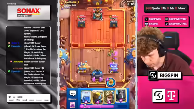 02:28:20Der Streamer spielt gegen verschiedene Gegner mit unterschiedlichen Deck-Strategien, darunter Mini Pekka Bats und Lock-Off Decks. Er beschreibt, wie er auf die unterschiedlichen Taktiken des Gegners reagiert und erklärt, warum bestimmte Karten oder Kombinationen für ihn problematisch sind. Der Streamer zeigt sich frustriert von manchen Spielsituationen, in denen er das Gefühl hat, keine Chance zu haben, besonders wenn der Gegner unerwartete Karten wie Barbed Wire spielt.