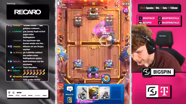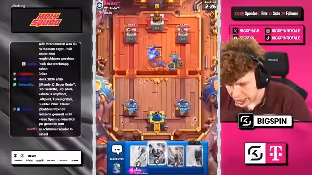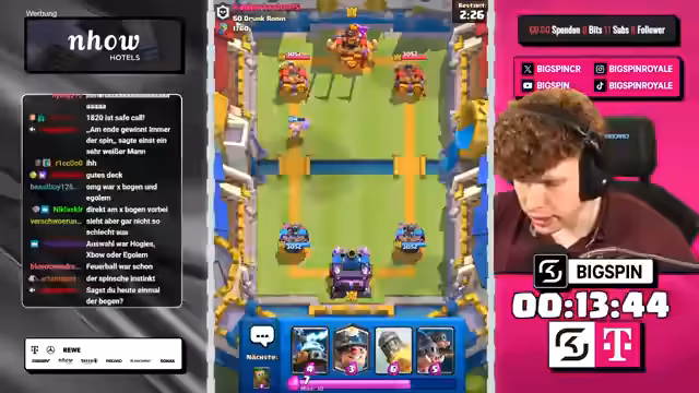 03:10:12Bei der Situation mit Nachthexen zeigt sich der Streamer frustriert und bemerkt, dass beide Türmen bereits außer Gefecht sind. Er stellt infrage, wie er langfristig gegen einen Inferno Dragon bestehen kann, da dies aktuell sein Hauptproblem darstellt. Trotz allem entscheidet er sich, einen Prinzen ins Spiel zu bringen, während er auch Evo-Zap als wertvolle Ressource im Deck ansieht. Die Dynamik des Spiels bleibt ungewiss, da der Gegner weiterhin aggressiv vorgeht.