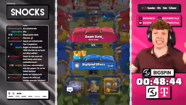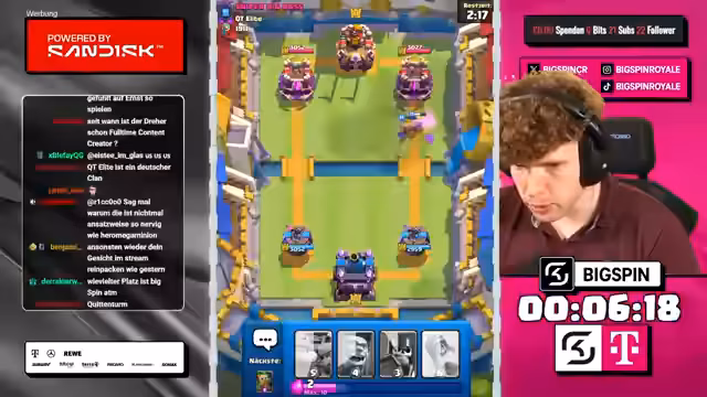 01:08:01Der Streamer entscheidet sich, fortan nur noch die jeweils teuersten Karten zu wählen, was die Strategie grundlegend verändert. Sein neues Deck besteht aus Karten wie Royal Giant, Sparky und Pekka, die zusammen starke Kombinationen erlauben. Besonders erfolgreich ist der Einsatz von Guards und Minions, die es ihm ermöglichen, gegnerische Angriffe effektiv zu kontern und gleichzeitig selbst Druck aufzubauen. Diese neue Herangehensweise führt zu mehreren Siegen und stabilisiert seine Position im Ranking.