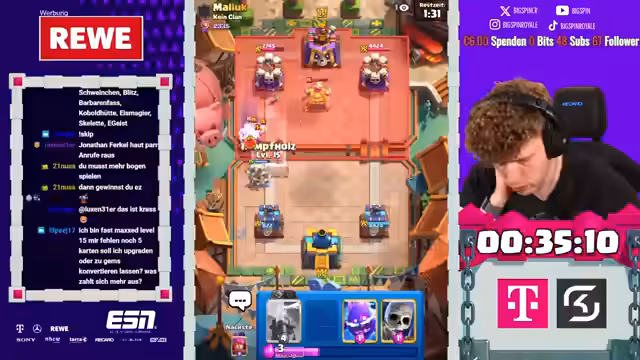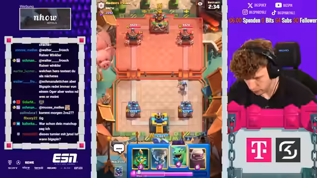02:10:30In einem intensiven Match gegen ein vermeintliches Cycle-Deck setzte der Spieler eine Valkyrie ein, die sich jedoch als Fehlentscheidung erwies, da sie direkt in einen Charge lief. Trotz dieses Rückschlags gelang es, die Bossband nach hinten zu positionieren und den Dartgoblin auf den Bomber zu fokussieren. Eine geschickte Platzierung der Skami und ein präziser Quickscope des Henkers, der alle Gegner traf, führten zu einem erfolgreichen Abschluss der Runde. Kurz darauf stellte sich der nächste Gegner als Spieler eines Huggies-Raketen-Decks heraus, was eine strategische Neuausrichtung erforderte. Der Henker wurde hinten platziert, doch der Gegner konterte mit einem Drill, der die Verteidigung unter Druck setzte. Ein schlecht getimter Schneeball und ein ineffektiver Charge verhinderten den Durchbruch, was die Notwendigkeit einer besseren Koordination der Angriffe unterstrich.