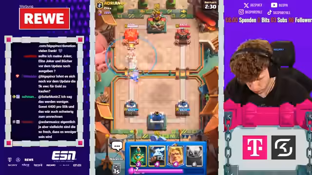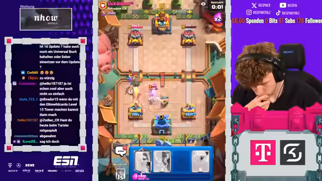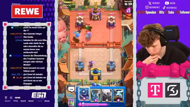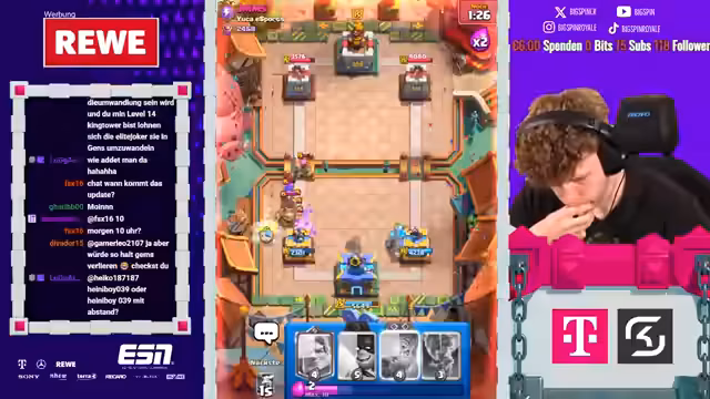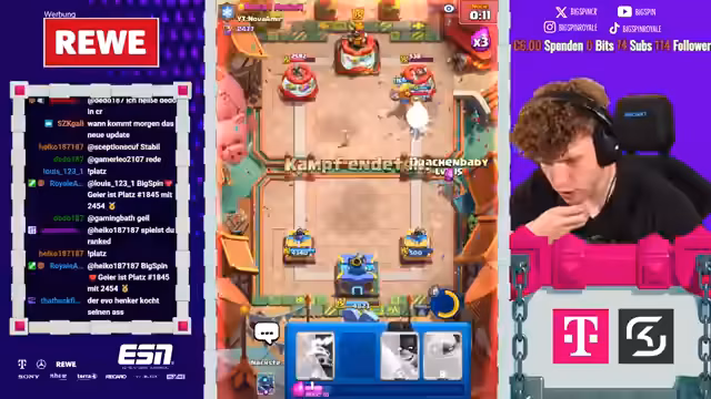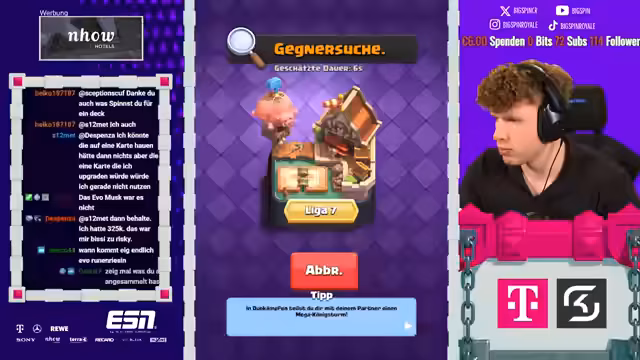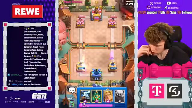 01:30:13Der Streamer startet das erste Match mit einem kopierten Deck und trifft auf einen Gegner mit Warbreaker und Eismagier, was auf ein Golem-Poison-Deck hindeutet. Die Verteidigung gegen Warbreaker erweist sich als schwierig, und die Platzierung der Elixierpumpe wird zu einer Herausforderung, da der Gegner gute Konterkarten besitzt. Der Fokus liegt darauf, die Evolutionen schnell zu zykeln, um einen Vorteil zu erzielen. Trotz anfänglicher Schwierigkeiten gelingt es, einen Golem-Heilerin-Push aufzubauen, der den Gegner unter Druck setzt. Die strategische Nutzung von Einheiten und Zaubern führt schließlich zum Sieg, wobei die Effektivität des Golem-Decks unter Beweis gestellt wird. Die Community wird zudem auf die WhatsApp-Gruppe des Streamers hingewiesen.