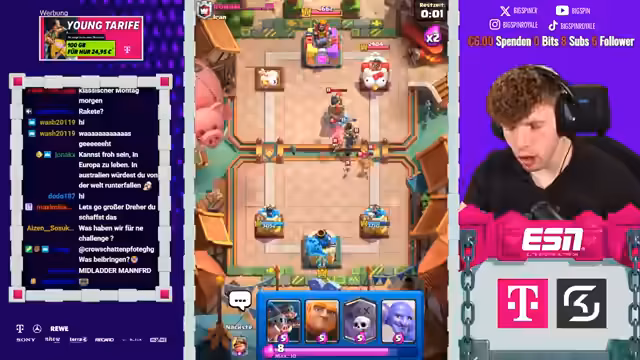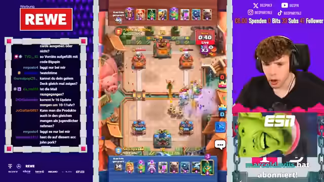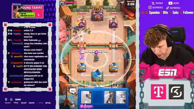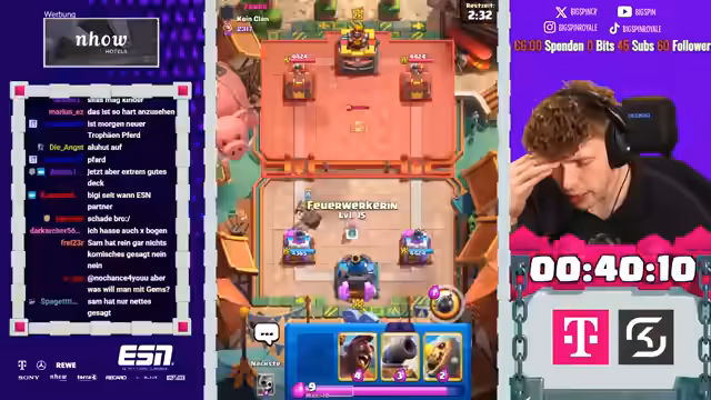 00:40:29Die aktuelle Challenge erweist sich als äußerst schwierig, da der Spieler Schwierigkeiten hat, den Minipacker zu verteidigen und den Miner effektiv einzusetzen. Trotz des Einsatzes eines Goblin Giants und der Hoffnung auf einen Turmverlust des Gegners, wird der Turm nicht eingenommen. Der Spieler gesteht, dass die Challenge nach Gant geht und er ursprünglich etwas Cooles vorhatte. Nach dieser Niederlage wird ein weiterer Versuch gestartet, um mehr als zwei Siege zu erzielen, da die vorherigen Spiele als unglücklich empfunden wurden. Der Spieler tritt gegen Sozio D aus Los 600 an und ist entschlossen, diesmal zu gewinnen.