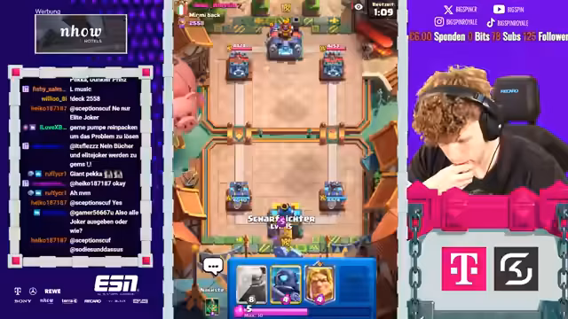 01:33:14Im zweiten Spiel tritt der Streamer mit dem Deck eines anderen Spielers an und trifft auf einen Gegner mit Kanone, Mighty Miner und möglicherweise einem Royal Hawks-Deck mit Lightning. Die Platzierung der Hütte und die Verteidigung gegen den Hog Rider erweisen sich als knifflig. Der Gegner nutzt Lightning effektiv, um Value zu generieren und den Streamer unter Druck zu setzen. Trotz guter Plays und dem Versuch, den Gegner zu überlisten, bleibt das Match eng. Der Streamer muss seine Strategie anpassen, um den Lightning-Schaden zu minimieren und gleichzeitig eigenen Druck aufzubauen. Das Spiel ist von ständigen Kontern und knappen Entscheidungen geprägt, wobei der Lightning des Gegners als besonders nervig empfunden wird.