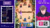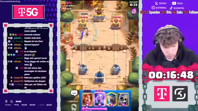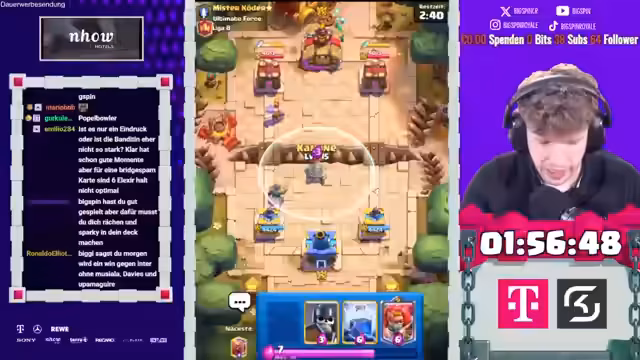 02:45:05Es wird beschlossen, das Deck des Gegners auszuprobieren, beginnend mit einem aggressiven Einsatz der Bell auf den Turm. Der Gegner kontert mit einem E-Wus und einer Sparky, was zu einer unerwarteten Situation führt. Ein geplanter Charge, der den Sparky-Hit ausweichen sollte, scheitert aufgrund von Soundproblemen im Spiel. Nach zwei Stunden des Deck-Kopierens tritt Frustration auf, besonders gegenüber Gegnern, die scheinbar nur ihr Gehirn zum Tragen eines Special Caps benutzen. Es wird der Wunsch geäußert, gegen fairere Gegner zu spielen, die ihr Gehirn benutzen. Es wird maximaler Druck gefordert, um die Scherenherzogin zu kontern, und der Damage des Logs wird unterschätzt, was zu einem knappen Verlust führt. Der Gegner spielt mit Full-Level 14 und Level 15 Karten, was als unfair empfunden wird.